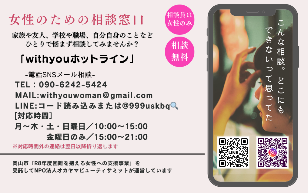 女性支援2026.04.01女性のための相談窓口「withyouホットライン」&居場所「YORIBAカフェmeet」紹介 こんにちは女性のための相談窓口「withyouホットライン」 2026年度も運営をさせていただきます! また居場所「YORIBAカフェmeet」は時間を拡大して15時半~21時半になりました。 今年度もどうぞよろしくお願いいたします。 「withyou」う~まんぱわぁ製作所 関連